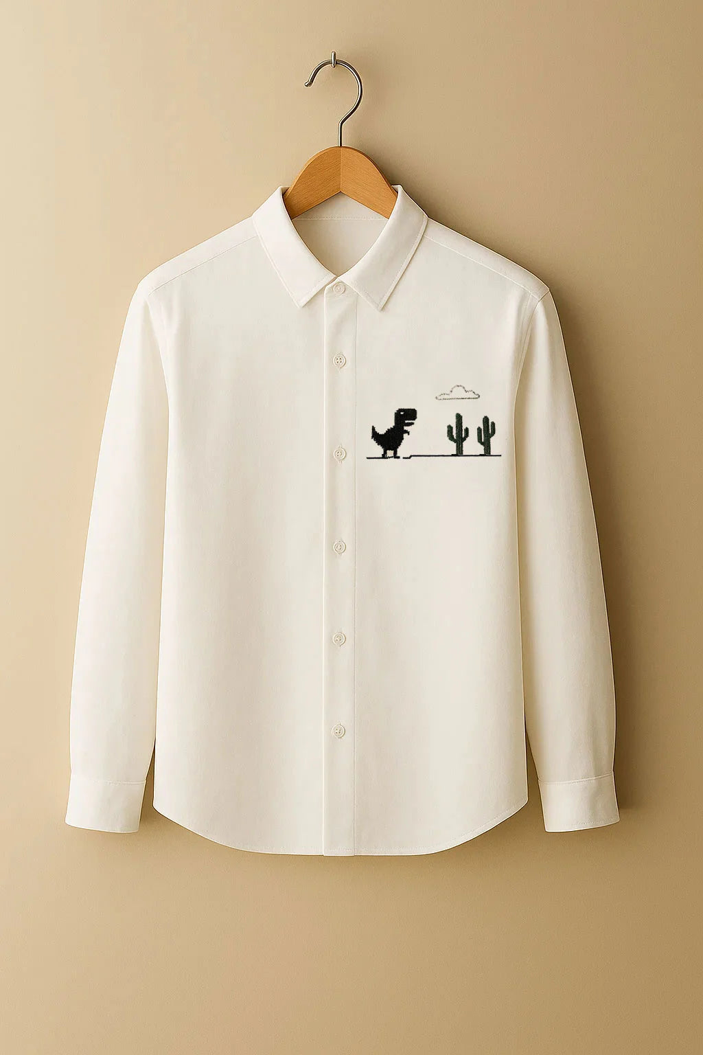 Made from soft, premium cotton, this off-white shirt brings comfort while keeping your style fresh. The highlight? A carefully embroidered pixel T-Rex on the chest — inspired by the Chrome offline dinosaur game we all know and love.