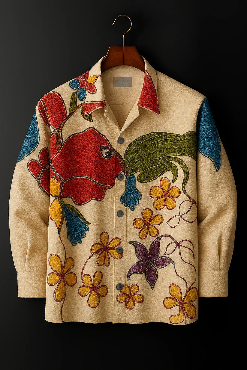 Premium Designer Shirt Leaf Embroidery, Premium Oversize Shirt Bird Design Late Night Layers – perfect for moonlit streets and good company. Designed for those who love bold prints and relaxed fits, this oversized Cuban collar shirt is your go-to for laid-back vibes and standout looks.