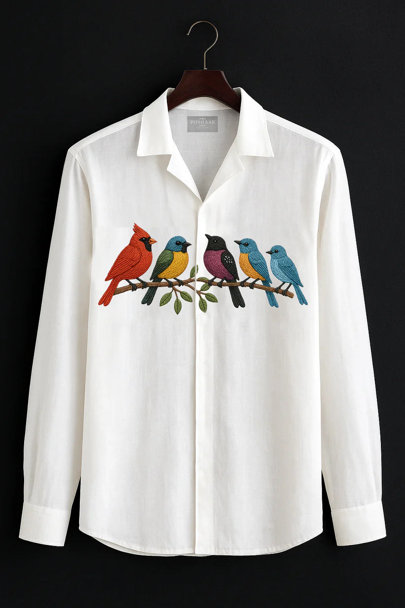 Premium Designer Shirt Leaf Embroidery, Premium Oversize Shirt Bird Design Late Night Layers – perfect for moonlit streets and good company. Designed for those who love bold prints and relaxed fits, this oversized Cuban collar shirt is your go-to for laid-back vibes and standout looks.